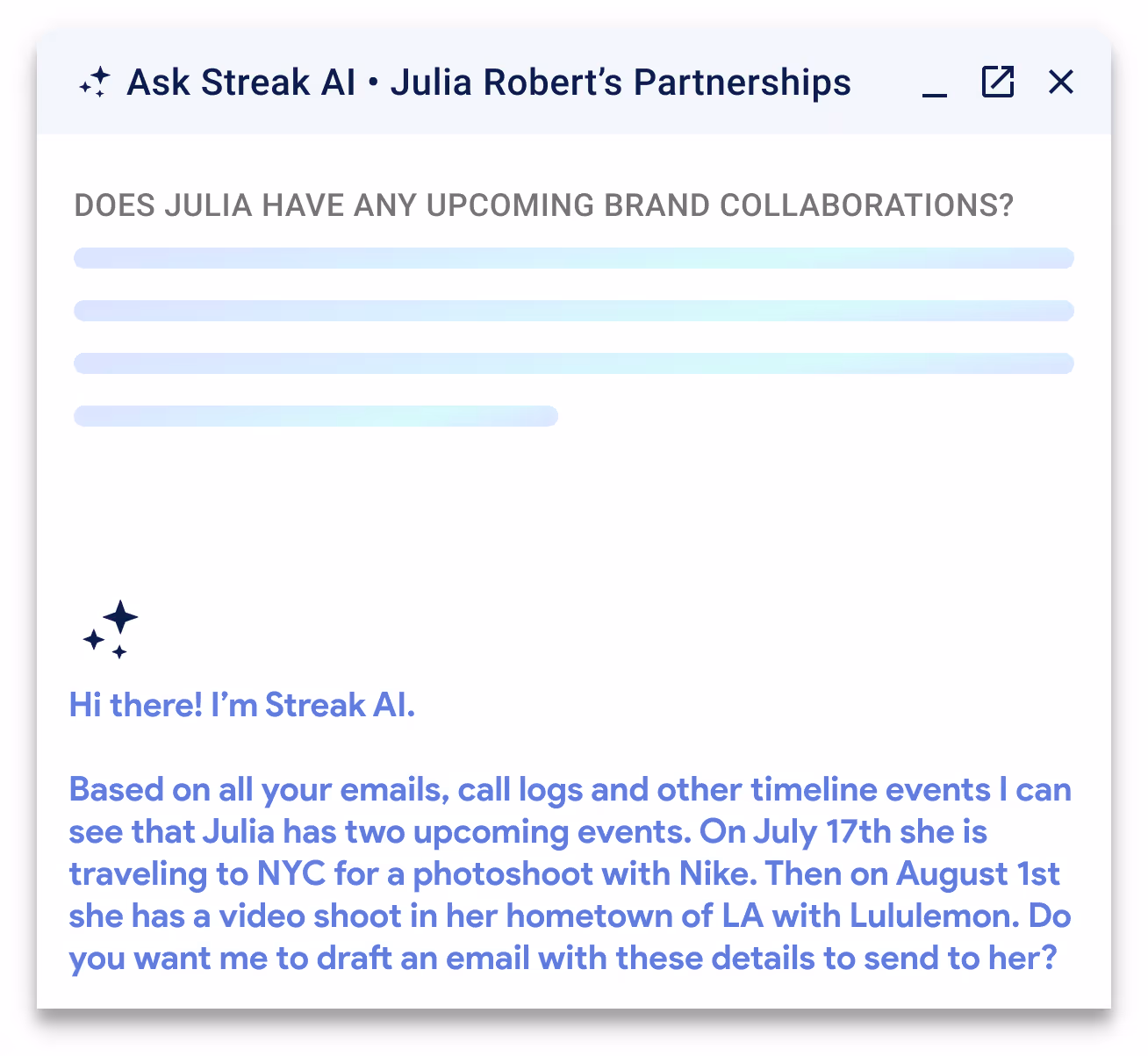 Manage talent and brand partnerships inside Gmail. Streak replaces spreadsheets and scattered tools with a fast, flexible CRM built into Google Workspace.