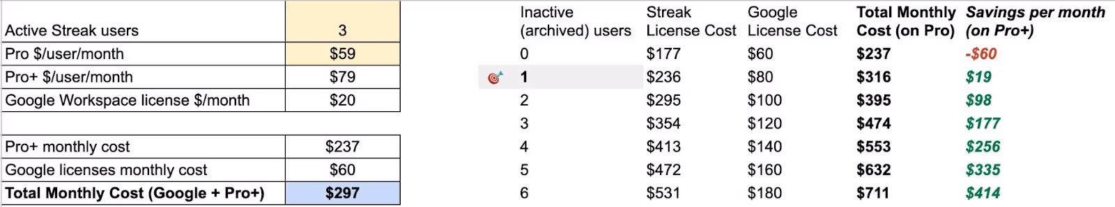 Make a copy of the calculator in Google Sheets and edit the values in yellow to see if and how you can save money by archiving users.