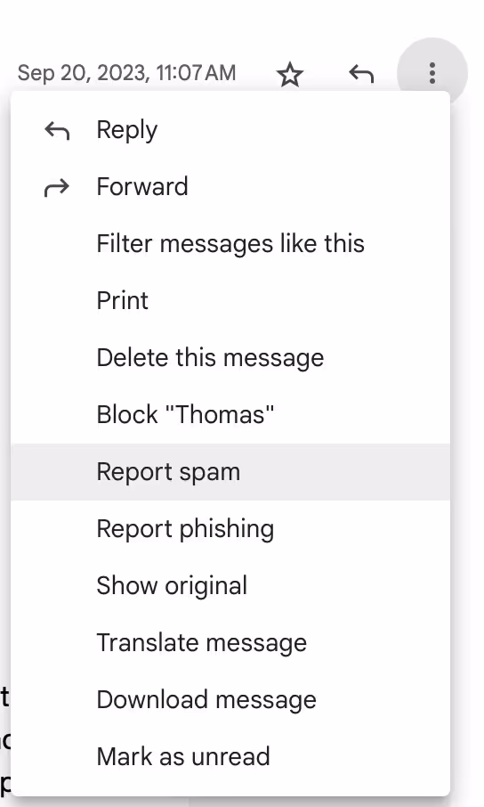 ![A screenshot of the email draft of Gmail in dark mode displaying the drop down menu after clicking the three dots at the upper right corner, with "Block [sender's name] highlighted](https://cdn.prod.website-files.com/5b7f24cc900973de13d7beb4/65317a822dedee6dd95053ce_5No6VK9aZc1qgWsIxpqKRNWxZngw3WQ0WllSbfZih1RuCEtqEv_CCLygiL4SoejUN9V8zn0RYATgokpV5M8d6OhO9154HzHS9GSSvlhc9Q-A8U3JaH46XIcRn7oyCZ_qEW5t9hLBhBYkwTaZKOAojwY.avif)