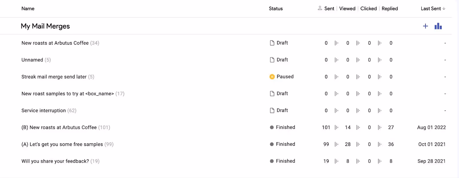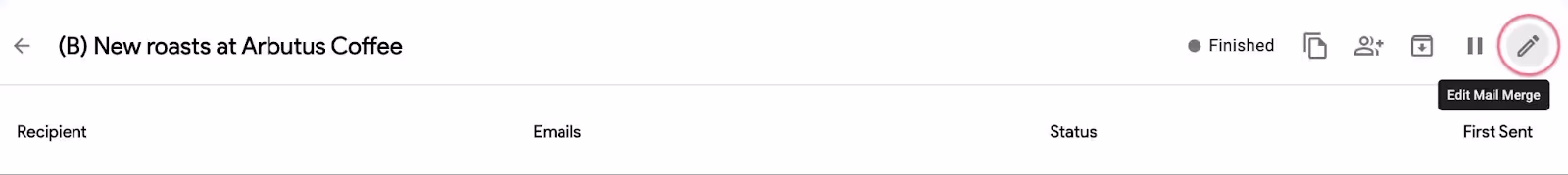 Need to try a new subject line for an active mail merge? Just hit the duplicate button to create a new mail merge with the same content.